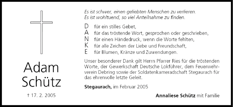 Hier finden Sie alle Traueranzeigen aus der Zeitung, die bisher für Adam Schütz erschienen sind. Weitere Traueranzeigen, die in der Zeitung erscheinen, werden hier ebenfalls aufgelistet