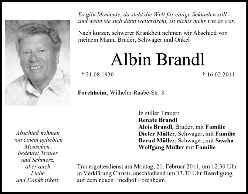 Hier finden Sie alle Traueranzeigen aus der Zeitung, die bisher für Albin Brandl erschienen sind. Weitere Traueranzeigen, die in der Zeitung erscheinen, werden hier ebenfalls aufgelistet