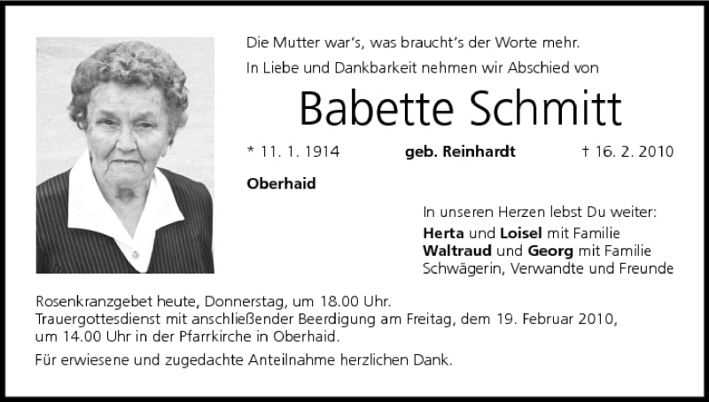 Hier finden Sie alle Traueranzeigen aus der Zeitung, die bisher für Babette Schmitt erschienen sind. Weitere Traueranzeigen, die in der Zeitung erscheinen, werden hier ebenfalls aufgelistet