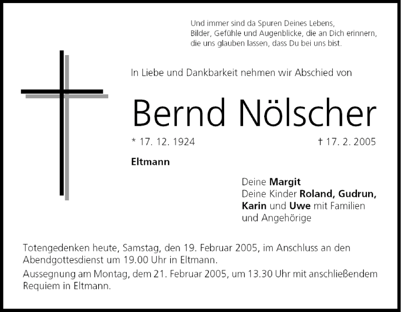 Hier finden Sie alle Traueranzeigen aus der Zeitung, die bisher für Bernd Nölscher erschienen sind. Weitere Traueranzeigen, die in der Zeitung erscheinen, werden hier ebenfalls aufgelistet