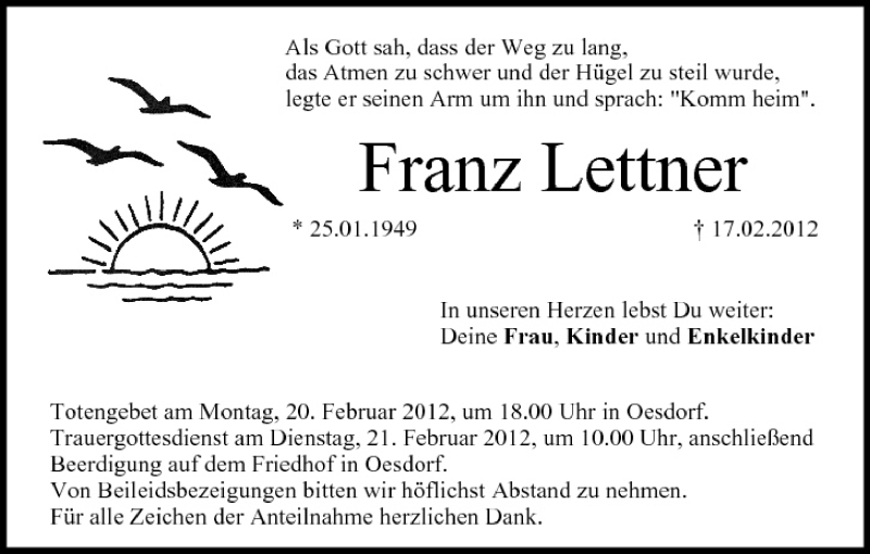 Hier finden Sie alle Traueranzeigen aus der Zeitung, die bisher für Franz Lettner erschienen sind. Weitere Traueranzeigen, die in der Zeitung erscheinen, werden hier ebenfalls aufgelistet