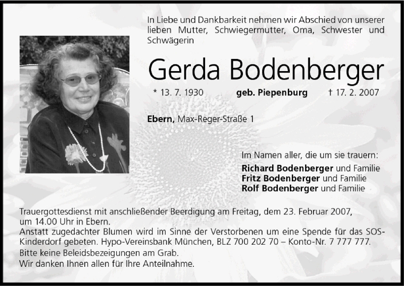 Hier finden Sie alle Traueranzeigen aus der Zeitung, die bisher für Gerda Bodenberger erschienen sind. Weitere Traueranzeigen, die in der Zeitung erscheinen, werden hier ebenfalls aufgelistet