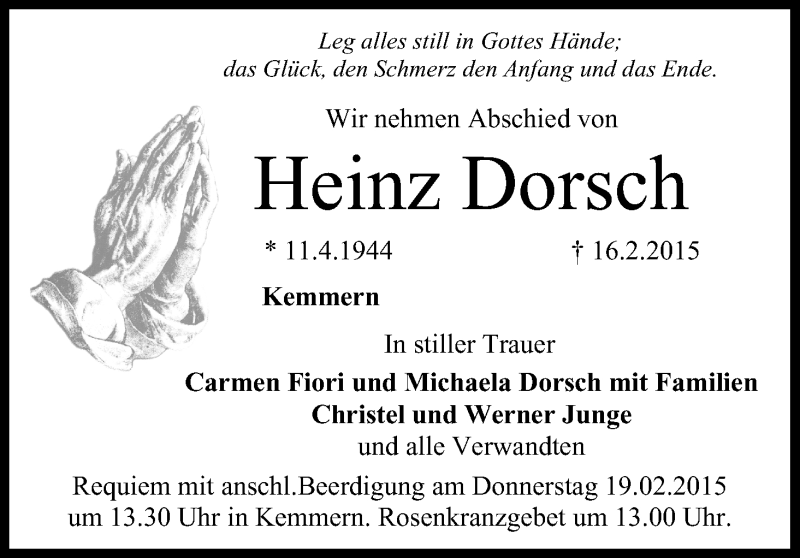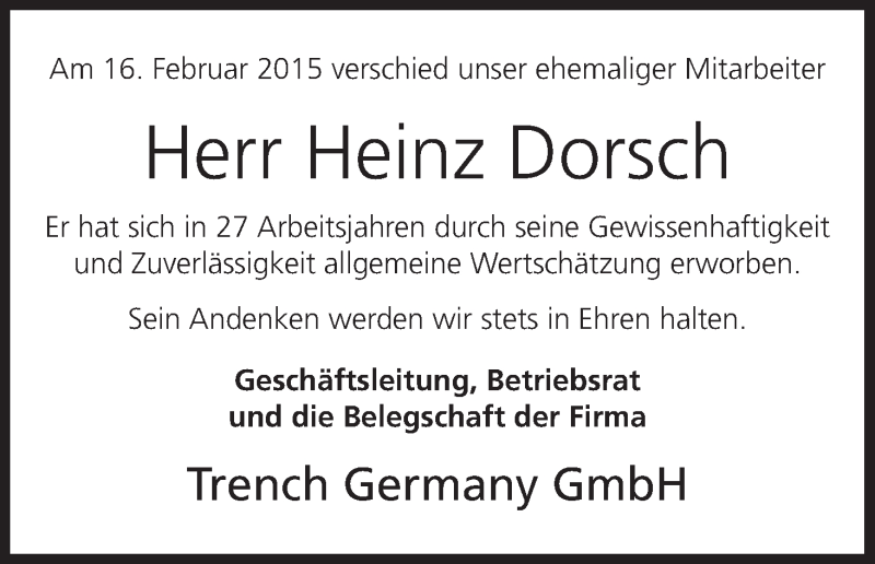 Hier finden Sie alle Traueranzeigen aus der Zeitung, die bisher für Heinz Dorsch erschienen sind. Weitere Traueranzeigen, die in der Zeitung erscheinen, werden hier ebenfalls aufgelistet