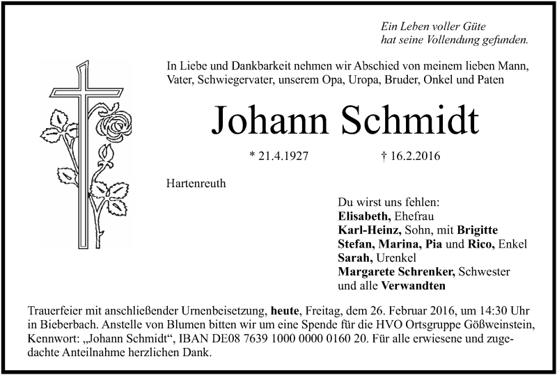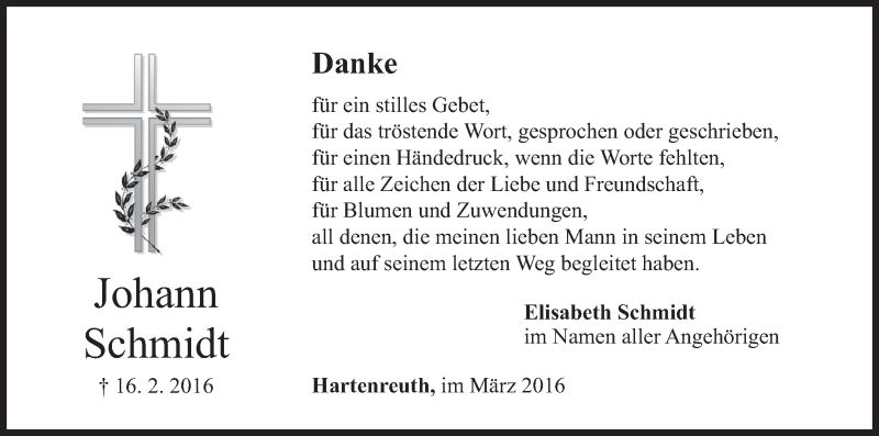 Hier finden Sie alle Traueranzeigen aus der Zeitung, die bisher für Johann Schmidt erschienen sind. Weitere Traueranzeigen, die in der Zeitung erscheinen, werden hier ebenfalls aufgelistet