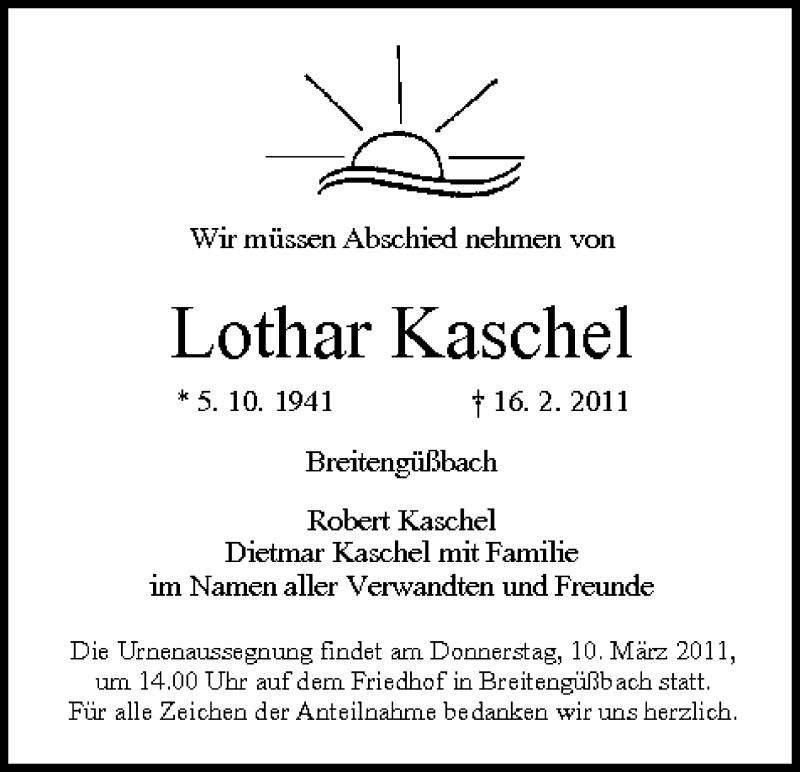 Hier finden Sie alle Traueranzeigen aus der Zeitung, die bisher für Lothar Kaschel erschienen sind. Weitere Traueranzeigen, die in der Zeitung erscheinen, werden hier ebenfalls aufgelistet