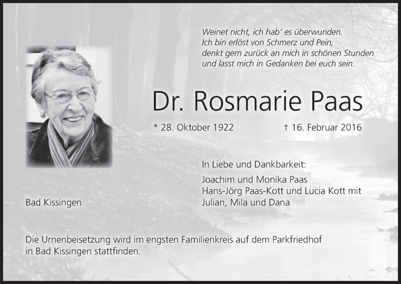 Hier finden Sie alle Traueranzeigen aus der Zeitung, die bisher für Rosmarie Paas erschienen sind. Weitere Traueranzeigen, die in der Zeitung erscheinen, werden hier ebenfalls aufgelistet