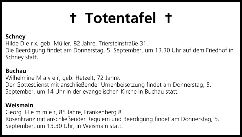 Hier finden Sie alle Traueranzeigen aus der Zeitung, die bisher für Totentafel vom 04.09.2013 erschienen sind. Weitere Traueranzeigen, die in der Zeitung erscheinen, werden hier ebenfalls aufgelistet